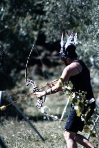 La zone de jeu ressemble à un petit village. On se faufile à travers les obstacles, on disparaît, on réapparaît. Personne n’est cantonné à sa base, les joueurs peuvent circuler librement, explorer, contourner. On se retrouve dans un univers vivant, un théâtre de mouvement où tout peut arriver. Le matériel, entièrement customisé par Guillaume, contribue à cette ambiance unique. Les masques personnalisés font office de peintures de guerre. Les arcs, les flèches, les abris, et même les sabliers qui trônent dans chaque camp nous font voyager dans un futur fantastique et tribal. Dès qu’on y entre, on comprend qu’on n’est pas là pour une simple partie, mais pour s’immerger totalement.